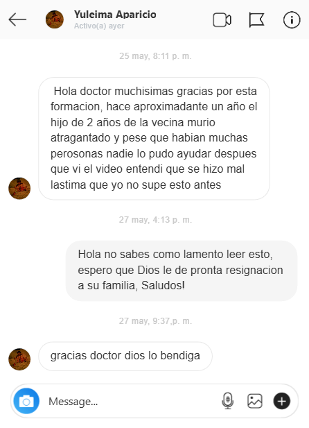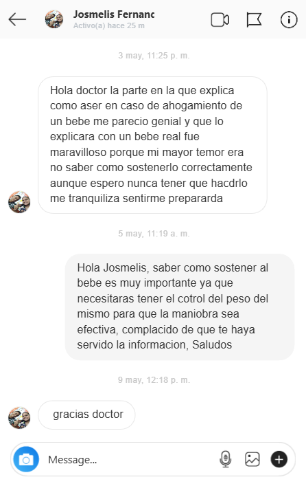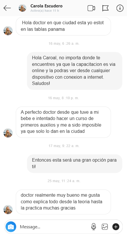 Hace 3 meses mi bebe se ahogó con leche y perdió el conocimiento, todo sucedió tan rápido gracias a Dios, paso un domingo y mi esposo estaba en casa y lo pudo ayudar antes de llevarlo a urgencias, yo me puse histérica y no sabía qué hacer, desde ese momento supe que necesitaba capacitarme en primeros auxilios pediátricos y tome este programa, es increíble tan completo y fácil de entender. gracias, gracias. gracias